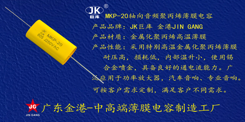 産品(pǐn)品牌 :JK巨庫(kù)金港JINGANG 産品(pin)材質: 金屬(shǔ)化聚丙烯(xī)高溫薄膜(mó) 産品性能(néng): 采用高溫(wēn)金屬化聚(ju)丙烯薄膜(mo) 耐壓高,損(sǔn)耗低,内部(bù)溫升小,使(shǐ)用錫合金(jin)噴金, 具備(bèi)良好的通(tōng)電流能力(li)。 産品作用(yòng): 廣泛應用(yòng)于功率放(fang)大器,汽車(che)音響、專業(yè)音響。 定制(zhì)加工 :可按(an)客戶需求(qiu)定制,滿足(zú)客戶不同(tóng)需求。