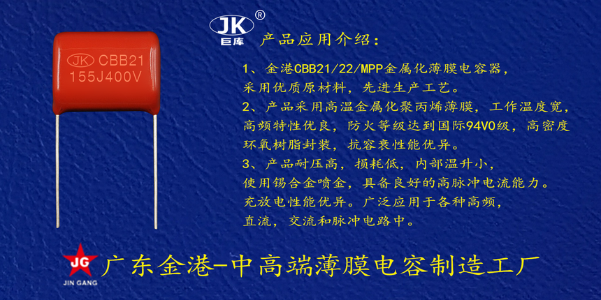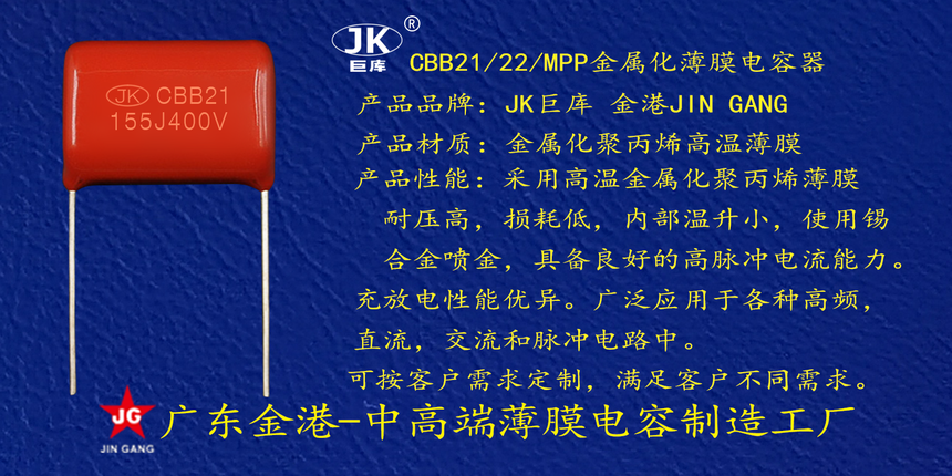 産品品(pǐn)牌 :JK巨庫金港JINGANG 産品(pǐn)材質: 金屬化聚丙(bing)烯高溫薄膜 産品(pǐn)性能: 采用高溫金(jin)屬化聚丙烯薄膜(mó) 耐壓高,損耗低,内(nèi)部溫升小,使用錫(xi)合金噴金, 具備良(liáng)好的高脈沖電流(liu)能力充放電性能(néng)優異。 産品作用: 廣(guǎng)泛應用于各種高(gāo)頻,直流,交流和脈(mò)沖電路中。 定制加(jia)工 :可按客戶需求(qiu)定制,滿足客戶不(bú)同需求。