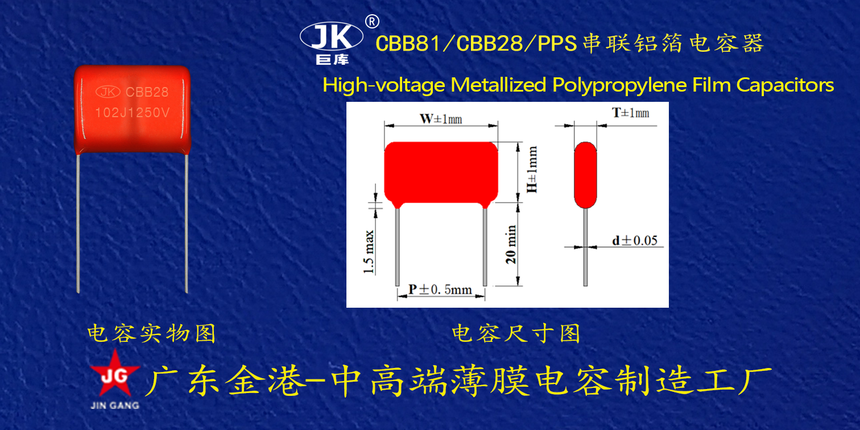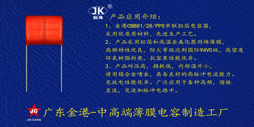 産品(pǐn)品牌 :JK巨庫金港(gǎng)JINGANG 産品材質: 金屬(shu)化聚丙烯高溫(wen)薄膜 産品性能(neng): 采用高溫金屬(shǔ)化聚丙烯薄膜(mo) 耐壓高,損耗低(dī),内部溫升小,使(shi)用錫合金噴金(jīn), 具備良好的高(gao)脈沖電流能力(li),充放電性能優(you)異。 産品作用: 廣(guǎng)泛應用于各種(zhǒng)高頻諧振,直流(liú),交流和脈沖電(dian)路中。 定制加工(gong) :可按客戶需求(qiu)定制,滿足客戶(hu)不同需求。