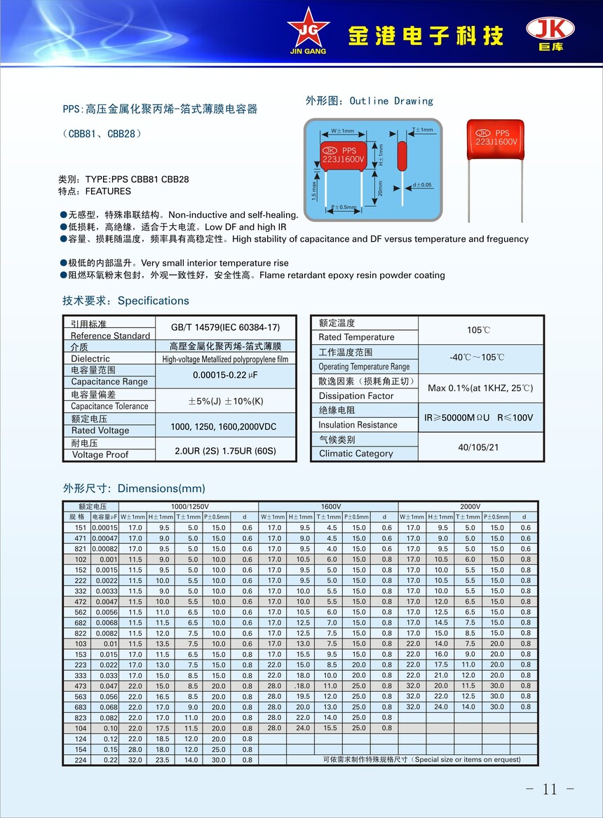 産(chan)品品牌 :JK巨庫金港(gang)JINGANG 産品材質: 金屬化(huà)聚丙烯高溫薄膜(mó) 産品性能: 采用高(gao)溫金屬化聚丙烯(xi)薄膜 耐壓高,損耗(hào)低,内部溫升小,使(shi)用錫合金噴金, 具(ju)備良好的高脈沖(chòng)電流能力,充放電(dian)性能優異。 産品作(zuo)用: 廣泛應用于各(ge)種高頻諧振,直流(liu),交流和脈沖電路(lu)中。 定制加工 :可按(àn)客戶需求定制,滿(man)足客戶不同需求(qiu)。