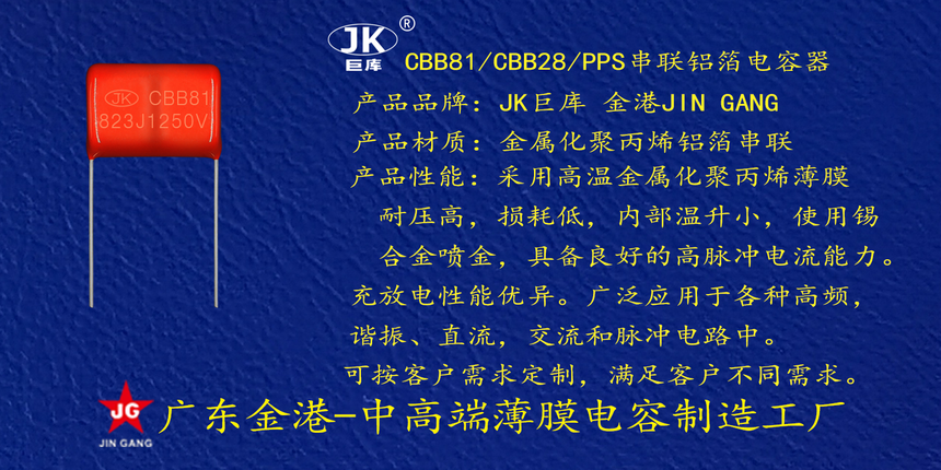 産品品牌(pái) :JK巨庫金港(gang)JINGANG 産品材質(zhì): 金屬化聚(jù)丙烯高溫(wēn)薄膜 産品(pin)性能: 采用(yong)高溫金屬(shu)化聚丙烯(xi)薄膜 耐壓(ya)高,損耗低(dī),内部溫升(shēng)小,使用錫(xī)合金噴金(jin), 具備良好(hǎo)的高脈沖(chong)電流能力(lì),充放電性(xìng)能優異。 産(chan)品作用: 廣(guǎng)泛應用于(yú)各種高頻(pin)諧振,直流(liu),交流和脈(mò)沖電路中(zhōng)。 定制加工(gong) :可按客戶(hu)需求定制(zhi),滿足客戶(hu)不同需求(qiú)。