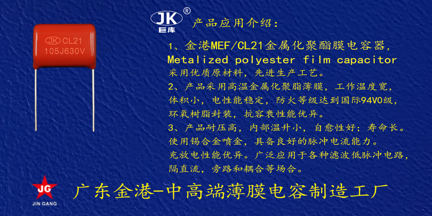 産品品牌(pái) :JK巨庫金港JINGANG 産品材(cai)質: 金屬化聚丙烯(xi)高溫薄膜 産品性(xìng)能: 采用高溫金屬(shu)化聚丙烯薄膜 耐(nai)壓高,損耗低,内部(bù)溫升小,使用錫合(he)金噴金, 具備良好(hǎo)的高脈沖電流能(néng)力,充放電性能優(you)異。 産品作用: 廣泛(fan)應用于各種隔直(zhí)流濾波,低脈沖電(dian)路,旁路和耦🔴合等(deng)場合。 定制加工 :可(ke)按客戶需求定制(zhi),滿足客戶不同需(xu)求。