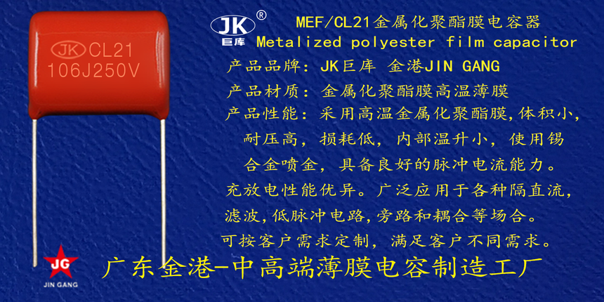 産品品牌 :JK巨(jù)庫金港JINGANG 産品材(cai)質: 金屬化聚丙(bing)烯高溫薄膜 産(chan)品性能: 采用高(gao)溫金屬化聚丙(bing)烯薄膜 耐壓高(gao),損耗低,内部溫(wen)升小,使用錫合(he)金噴金, 具備良(liang)好的高脈沖電(diàn)流能力,充放電(dian)性能優異。 産品(pin)作用: 廣泛應用(yong)于各種隔直流(liú)濾波,低脈沖電(dian)路,旁路和耦合(he)等🌍場合。 定制加(jia)工 :可按客戶需(xū)求定制,滿足客(kè)戶不同需求。