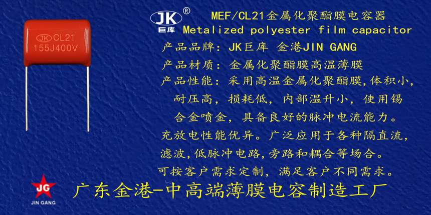 産品品牌 :JK巨(ju)庫金港JINGANG 産品材(cái)質: 金屬化聚丙(bǐng)烯高溫薄膜 産(chan)品性能: 采用高(gao)溫金屬化聚丙(bing)烯薄膜 耐壓高(gāo),損耗低,内部溫(wēn)升小,使用錫合(he)金噴金, 具備良(liáng)好的高脈沖電(dian)流能力,充放電(dian)性能優異。 産品(pin)作用: 廣泛應用(yòng)于各種隔直流(liú)濾波,低脈沖電(dian)路,旁路和耦合(he)等場🏃🏻♂️合。 定制加(jia)工 :可按客戶需(xū)求定制,滿足客(ke)戶不同需求。