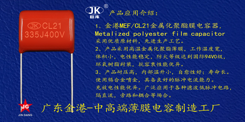 産品品牌(pai) :JK巨庫金港JINGANG 産品材(cái)質: 金屬化聚丙烯(xi)高溫薄膜 産品性(xìng)能: 采用高溫金屬(shǔ)化聚丙烯薄膜 耐(nai)壓高,損耗低,内部(bù)溫升小,使用錫合(he)金噴金, 具備良好(hao)的高脈沖電流能(neng)力,充放電性能優(yōu)異。 産品作用: 廣泛(fàn)應用于各種隔直(zhí)流濾波,低脈沖電(dian)路,旁路和耦合等(deng)場🔞合。 定制加工 :可(ke)按客戶需求定制(zhi),滿足客戶不同需(xu)求。