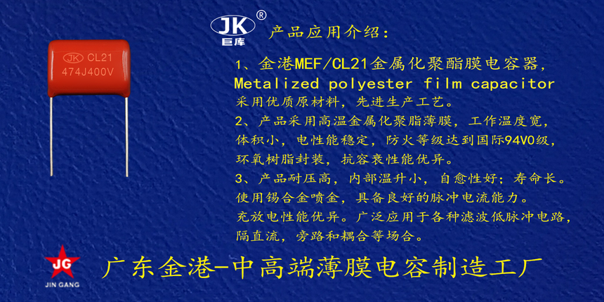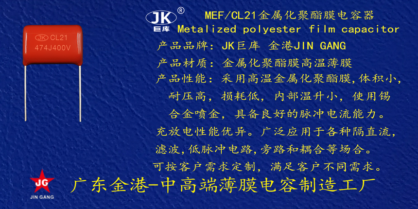 産品品牌 :JK巨(ju)庫金港JINGANG 産品材(cái)質: 金屬化聚丙(bing)烯高溫薄膜 産(chan)品性能: 采用高(gao)溫金屬化聚丙(bing)烯薄膜 耐壓高(gao),損耗低,内部溫(wen)升小,使用錫合(he)金噴金, 具備良(liang)好的高脈沖電(dian)流能力,充放電(diàn)性能優異。 産品(pin)作用: 廣泛應用(yong)于各種隔直流(liu)濾波,低脈沖電(diàn)路,旁路和耦合(he)等場⭐合。 定制加(jia)工 :可按客戶需(xū)求定制,滿足客(kè)戶不同需求。