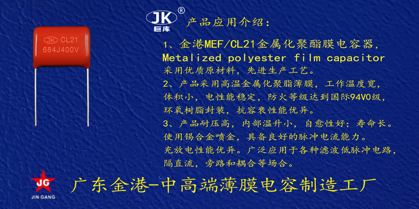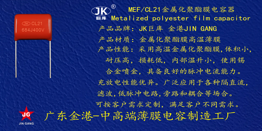 産品品牌(pai) :JK巨庫金港JINGANG 産(chan)品材質: 金屬(shǔ)化聚丙烯高(gāo)溫薄膜 産品(pin)性能: 采用高(gao)溫金屬化聚(jù)丙烯薄膜 耐(nai)壓高,損耗低(dī),内部溫升小(xiǎo),使用錫合金(jīn)噴金, 具備良(liang)好的高脈沖(chong)電流能力,充(chong)放電性能優(you)異。 産品作用(yòng): 廣泛應用于(yú)各種隔直流(liú)濾波,低脈沖(chong)電路,旁路和(he)耦🔅合🚶♀️等💜場合(hé)。 定制加工 :可(ke)按客戶需求(qiú)定制,滿足客(kè)戶不同需求(qiu)。