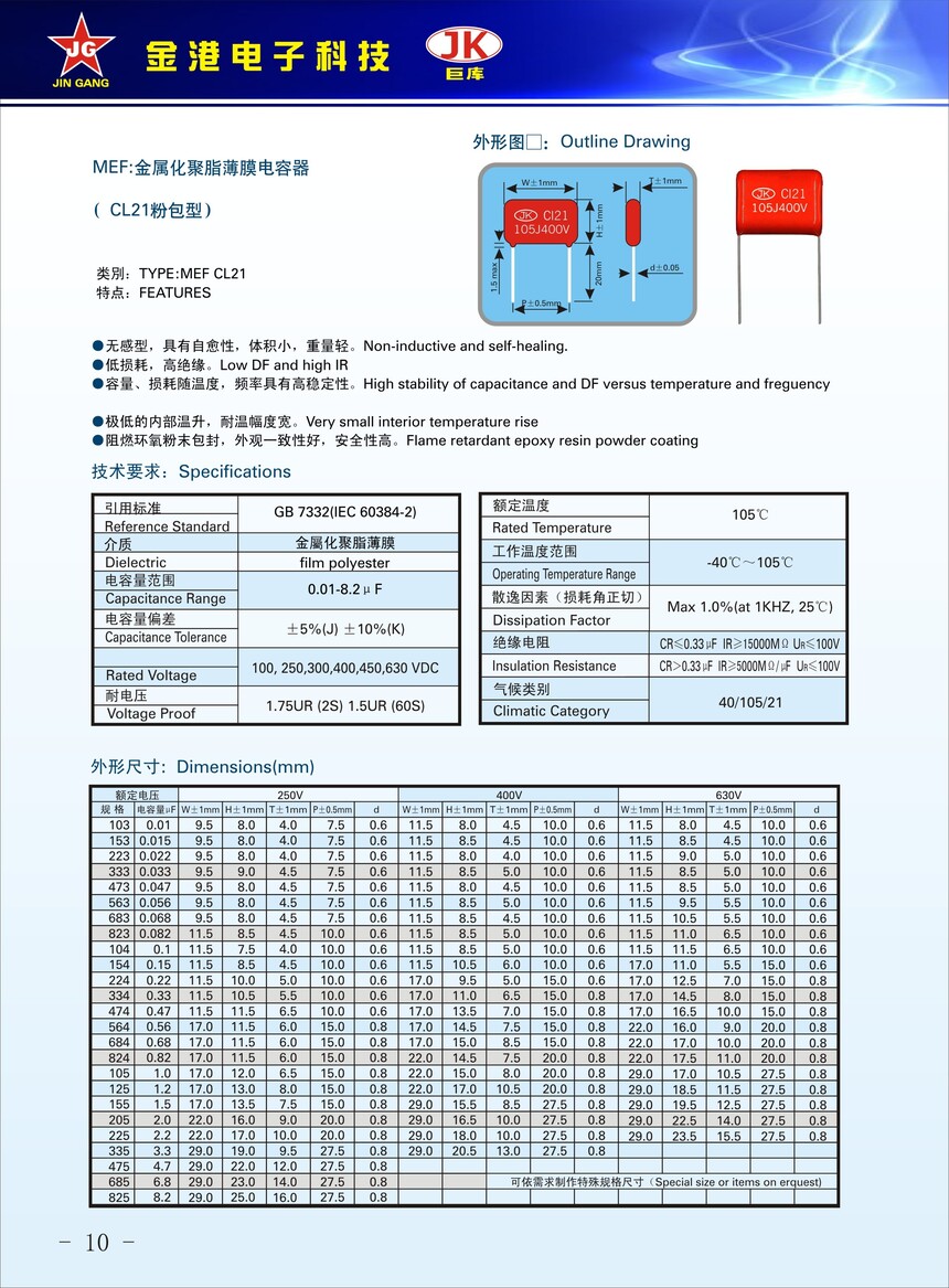 産品品牌(pái) :JK巨庫金港JINGANG 産(chan)品材質: 金屬(shǔ)化聚丙烯高(gao)溫薄膜 産品(pǐn)性能: 采用高(gāo)溫金屬化聚(ju)丙烯薄膜 耐(nài)壓高,損耗低(di),内部溫升小(xiao),使用錫合金(jīn)噴金, 具備良(liáng)好的高脈沖(chòng)電流能力,充(chōng)放電性能優(you)異。 産品作用(yòng): 廣泛應用于(yu)各種隔直流(liú)濾波,低脈沖(chong)電路,旁路和(he)耦🌐合等場合(he)。 定制加工 :可(kě)按客戶需求(qiu)定制,滿足客(kè)戶不同需求(qiú)。
