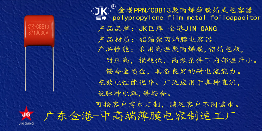 産(chan)品品牌 :JK巨庫金港(gang)JINGANG 産品材質: 鋁箔聚(ju)丙烯膜電容器 産(chǎn)品性能: 采用高溫(wēn)聚丙烯膜,鋁箔電(diàn)極耐壓高, 損耗低(di),i高頻條件下内部(bu)溫升小錫合金噴(pēn)金, 具備良好的耐(nài)電流能力。充放電(diàn)性能優異。 産品作(zuò)用: 廣泛應用于各(gè)種直流,低脈沖電(dian)路,等場合。 定制加(jiā)工 :可按客戶需求(qiu)定制,滿足客戶不(bú)同需求。