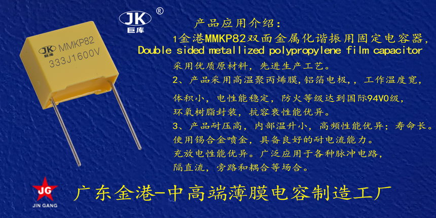 産(chan)品品牌 :JK巨庫(ku)金港JINGANG 産品材(cái)質: 雙面金屬(shu)化聚丙烯,塑(su)料外殼封裝(zhuang) 産品性能: 采(cai)用高溫雙面(miàn)化聚丙烯,耐(nai)壓高, 損耗低(di),高頻條件下(xia)内部溫升小(xiǎo)。錫合金噴金(jin), 具備良好的(de)耐電流能力(lì)。充放電性能(neng)優異。 産品作(zuò)用: 應用于高(gao)壓高頻脈沖(chòng)電路,諧振電(dian)路,等場合。