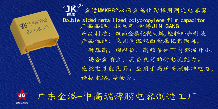 産品品牌 :JK巨庫(kù)金港JINGANG 産品材質: 雙(shuāng)面金屬化聚丙烯(xi),塑料外殼封裝 産(chan)品性能: 采用高溫(wen)雙面化聚丙烯,耐(nai)壓高, 損耗低,高頻(pín)條件下内部溫升(shēng)小。錫合金噴金, 具(jù)備良好的耐電流(liú)能力。充放電性能(néng)優異。 産品作用: 應(ying)用于高壓高頻脈(mo)沖電路,諧振電路(lù),等場合。