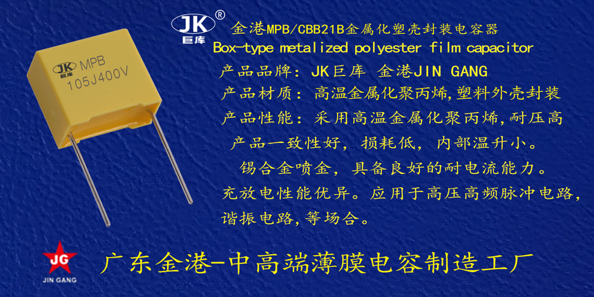 産品品(pǐn)牌 :JK巨庫金港JINGANG 産品(pin)材質: 高溫金屬化(huà)聚丙烯,塑料外殼(ké)封裝 産品性能: 采(cǎi)用高溫金屬化聚(ju)丙烯,耐壓高産品(pǐn)一緻性好, 損耗低(dī),内部溫升小。錫合(hé)金噴金, 具備良好(hǎo)的耐電流能力。充(chong)放電性能優異。 産(chan)品作用: 應用于高(gao)壓高頻脈沖電路(lu),諧振電路,等場合(hé)。