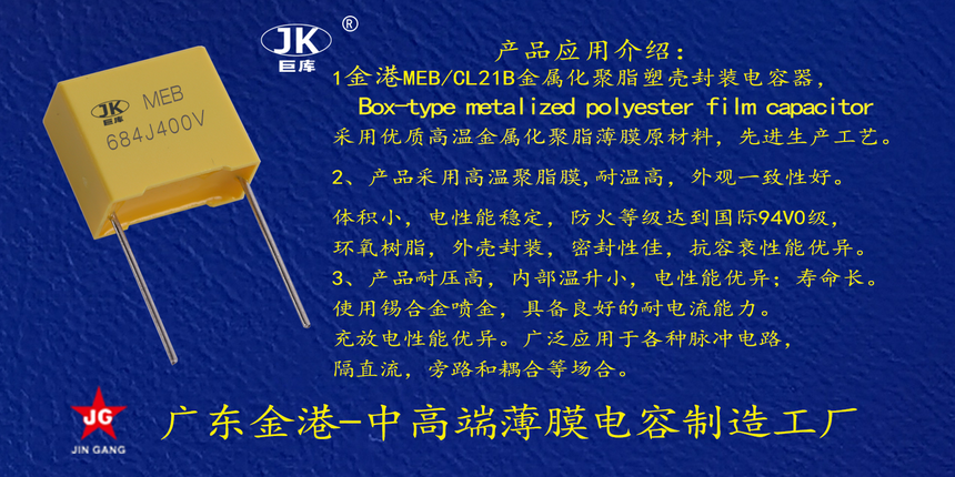 産品品(pin)牌 :JK巨庫金港(gǎng)JINGANG 産品材質: 高(gao)溫金屬化聚(jù)脂薄膜,塑料(liào)外殼封裝 産(chǎn)品性能: 采用(yong)高溫金屬化(huà)聚脂薄膜,耐(nài)壓高